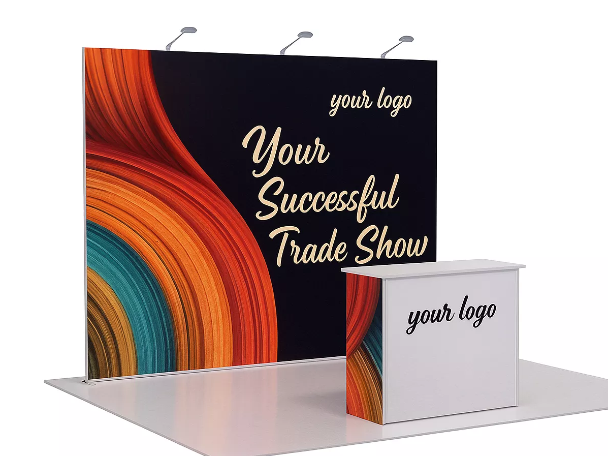 This booth design combines the Qseg 40 WidePro backwall with the Qbic 40 Counter to create a simple yet effective setup. The system emphasizes ease of use, lightweight construction, and universal appeal, making it an ideal solution for compact exhibition spaces. Its straightforward design ensures quick assembly and portability, while maintaining a professional and impactful presence on the show floor.